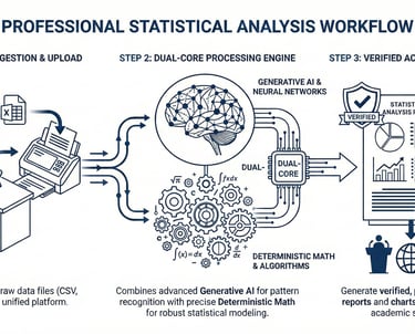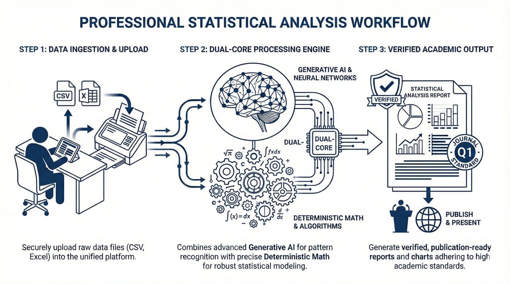 The application provides a professional workflow that ingests raw data and uses a hybrid "dual-core" engine combining generative AI and deterministic math to produce verified, academic-standard statistical reports and charts for publication.