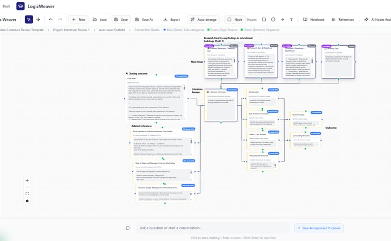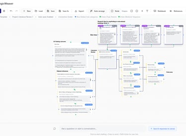 LogicWeaver is a visual research-planning environment that helps you move from a vague idea to a structured, supervisor-ready plan. Instead of working in a long document, you build your project as interconnected nodes—problem, aims, questions, methods, data, and key references—with AI support at every step.